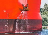 Het schip nadert langzaam de haven van Amsterdam. Een kleine boeggolf spreidt zich uit, breekt tegen de gladde huid van het kanaal. Ballastwater stroomt via de boeg naar beneden als een smalle waterval, glinsterend in de zon. Langs de oever staan rijen groene bomen stil in het licht, strak tegen de blauwe lucht. In het water, vlak boven de waterlijn van het zeeschip, zijn donkere sporen zichtbaar—afdrukken van autobanden aan de reling van de sleepboten, Alles beweegt, maar beheerst. Een schip onderweg, zwaar en kalm. Een loods op de brug, de bemanning klaar om de sleeptrossen van sleepboten over te pakken.