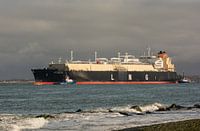 Zeeschip onderweg op de Nieuwe Waterweg met slepers.