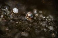 Dit abstracte beeld vangt de betoverende schoonheid van zeepschuim en transformeert het in een kosmisch tafereel vol licht en schaduw. De iriserende kleuren, gecreëerd door het licht dat op het schuim weerkaatst, roepen herinneringen op aan verre sterrenstelsels, wat het beeld een buitenaardse sfeer geeft. De ingewikkelde patronen en…