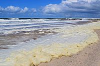 Zeeschuim op het strand met veel wind