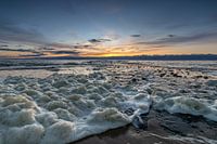 Zeeschuim spoelt aan op het strand van Den Helder bij een pier tijdens een kleurrijke zonsondergang van Bram Lubbers
