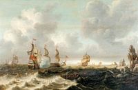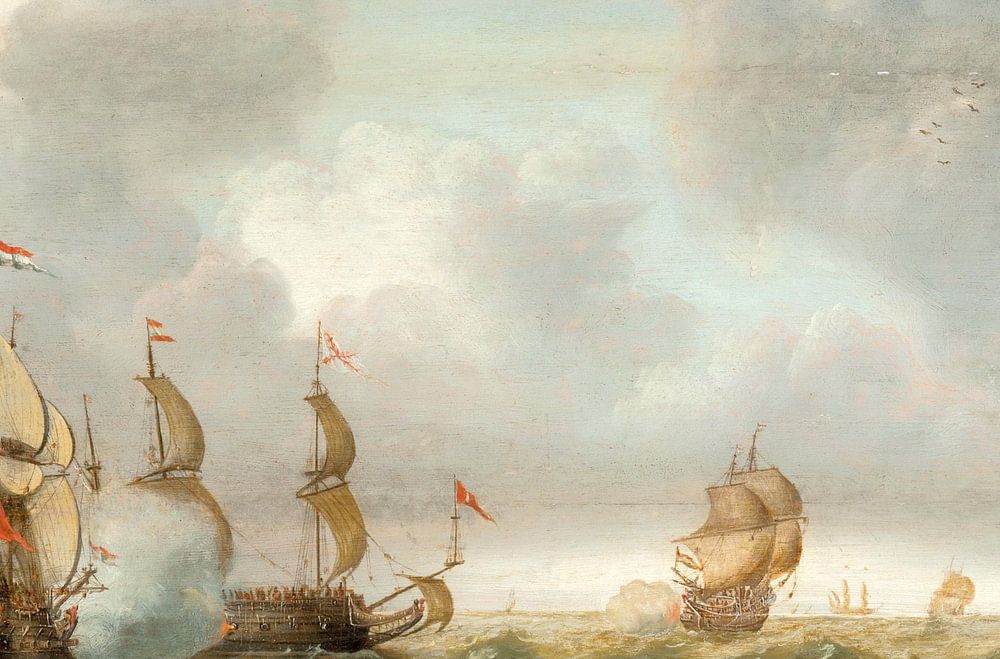 Een oorlogsschip of oorlogsbodem vuurt op een schip onder de vlag van Nederland met op de spiegel twee leeuwen. Mannen vluchten op een roeiboot uit deze zeeslag. Een marine met een stukje uit een oorlog.