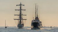 Zeesleepboot Holland passeert driemaster Artemis tijdens de Tall Ship Race finish 2018 bij Port of Harlingen.