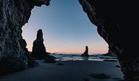 Zeestapels vanuit een zeegrot in Bandon, Oregon na zonsondergang.