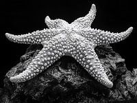 In deze wart-wit foto ligt een zeester stil op een ruwe rots, haar armen uitgespreid als een gestolde beweging. De textuur van haar huid contrasteert subtiel met het steenoppervlak. De achtergrond is diep zwart, waardoor het tafereel geïsoleerd en tijdloos aanvoelt — een verstild moment in de diepte van de oceaan.