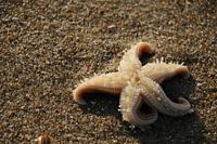 Aangespoelde zeester op het strand in Hargen, Noord-Holland. De zeester ligt onderste boven.