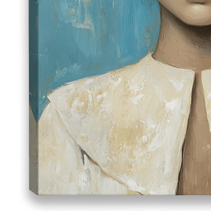 Abstract impressionistisch portret van een Zeeuws meisje in crème tinten met goud elementen op een licht blauwe achtergrond.