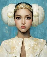 Abstract impressionistisch portret van een Zeeuws meisje in crème tinten met goud elementen op een licht blauwe achtergrond.