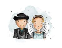 Leuke originele waterverf illustratie van een Zeeuws meisje en Zeeuwse jongen in Walcherse klederdracht.