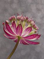 "Zeeuws knoopje met gemêleerde grijsachtige achtergrond" is een macrofoto van een bloem van een Zeeuws Knoopje (Astrantia Major). Dit prachtige bloemetje is schuin van achteren gefotografeerd, zodat je de fuchsia / paars kleurige blaadjes mooi ziet. Vanaf deze fuchsia kleurige blaadjes, waar de scherpte op ligt op de rechterbloemblaadjes, vervaagd alles langzaam wat zich ervoor en erachter bevind. Dit geeft een gevoel van diepte in het werk en creëert ook tegelijkertijd hiermee een dromerig sfeertje. Als je inzoomt op het werk kun je dit goed zien. De "kleine bloemetjes" (de stempels lijken net ook kleine bloemetjes) zijn vaag achter de blaadjes te zien, maar nog goed herkenbaar. De grijs gemêleerde achtergrond zorgt ervoor dat het bloemetje mooi los komt van de achtergrond.