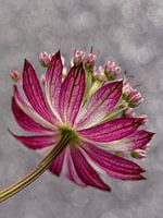 "Zeeuws knoopje met grijstinten op de achtergrond" is een macrofoto van een bloem van een Zeeuws Knoopje (Astrantia Major). Dit prachtige bloemetje is schuin van achteren gefotografeerd, zodat je de fuchsia / paars kleurige blaadjes mooi ziet. Vanaf deze fuchsia kleurige blaadjes, waar de scherpte op ligt op de rechterbloemblaadjes, vervaagd alles langzaam wat zich ervoor en erachter bevind. Dit geeft een gevoel van diepte in het werk en creëert ook tegelijkertijd hiermee een dromerig sfeertje. Als je inzoomt op het werk kun je dit goed zien. De "kleine bloemetjes" (de stempels lijken net ook kleine bloemetjes) zijn vaag achter de blaadjes te zien, maar nog goed herkenbaar. De grijs gemêleerde achtergrond zorgt ervoor dat het bloemetje mooi los komt van de achtergrond.