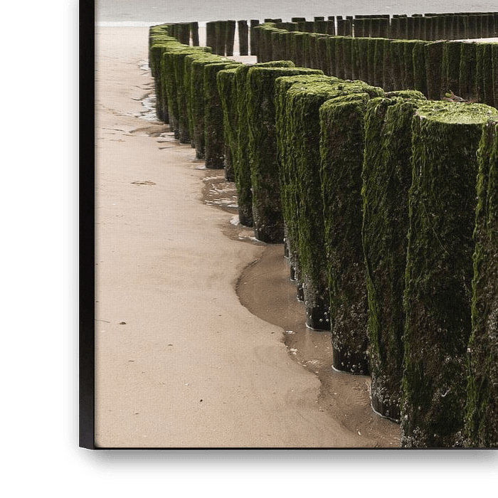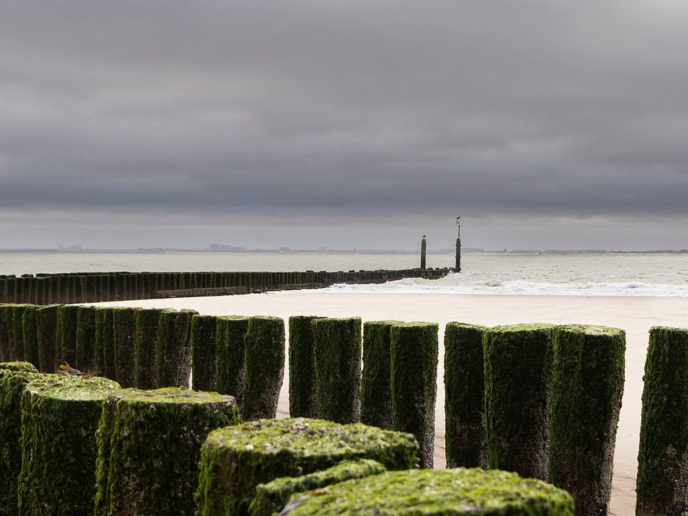 Paalhoofden op het strand die in een mooie bocht de zee in lopen. Onder een donkere onheilspellende lucht.