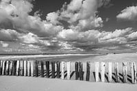 Paalhoofden op het brede strand van Zeeuws Vlaanderen op een heldere dag met zon en stapelwolken. Wandelaars trotseren de straffe zeewind en waaien uit langs de onstuimige branding.