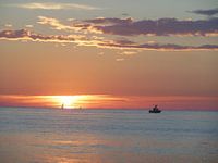 het Zeeuwse strand bij zonsondergang met enkele schepen