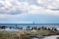 Op Gotland aan de kust zit en zwemt een grote groep vogels waaronder veel aalscholvers, jonge meeuwen, een zwaan en in zee een groep futen. Op de voorgrond met gele kortsmos begroeide keien en grijsgroene alsem. De grote keien waar de vogels op zitten zijn wit van de guano wat duidelijk maakt de de vogels en met name de aalscholvers…
