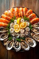 Een kunstig arrangement van delicate zeevruchten tapdanst in een feestelijke dans van kleuren en texturen. Sappige garnalen en fijne oesters omringen verse citroenen, die een pittig accent toevoegen. Dit schilderij is ideaal voor de keuken of eethoek en brengt maritieme elegantie en plezier in elk huis.