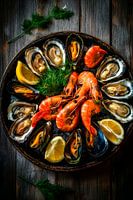 Een verleidelijke selectie verse zeevruchten, kunstig gerangschikt op een rustieke houten plank, ademt de geur van de oceaan. De levendige kleuren van de garnalen en oesters, vergezeld van verfrissende schijfjes citroen, nodigen je uit om te genieten van momenten van verwennerij. Perfect voor een gezellige keuken of een stijlvolle eetkamer waar de zintuigen worden verwend.