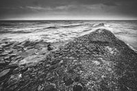 Stenen dam langs de dijken van Friesland ter bescherming van de haven bij Hindelopen. Stormachtig weer met beukende golven die over de Zeewering heen slaan en een dramatische dynamiek aan deze landschapsfoto geven