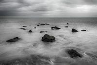 Sfeervolle zwart-wit foto van het uitzicht op zee vanaf het strand van Renesse in Zeeland. Door de vloed is de golfbreker voor een groot deel verdwenen in zee.