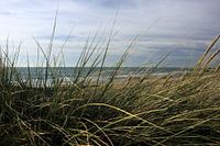 Zeezicht Westkapelle gezien vanaf de duin rug,kleur opname. Met het helmgras op de voorgrond vormt het een mooie doorkijk naar het strand en de Oosterschelde.