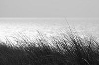 Zeezicht Zoutelande gezien vanaf de duinrug,zwart/wit opname. Met het helmgras op de voorgrond vormt het een mooie doorkijk naar de Oosterschelde.