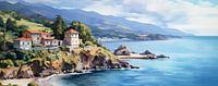 Zeezicht met Villa's | Kustlandschap Schilderij - Dit schilderij toont een schilderachtig kusttafereel met traditionele architectuur op een klif. De compositie balanceert elegant tussen de robuuste charme van de natuur en de menselijke aanwezigheid, met een achtergrond van bergen en een rustige zee. Het kleurenpalet is rijk aan diverse blauwtinten, dassen van groen en aardetinten met een nadruk op de terracotta daken.