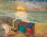 Op de voorgrond van dit zeezicht schilderij zijn een aantal strandcabines en een parasol zichtbaar. Dit impressionistische werk is vermoedelijk geschilderd op het strand van De Panne of Oost-Duinkerke. Twee badplaatsen aan de Belgische kust waar Pieter Ringoot vaak zijn vakantie doorbracht.