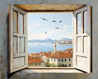 Zeezicht - In dit schilderij zie je een mooie weergave van een zeezicht door een open raam, met de kleurrijke daken van een stad en een heldere blauwe lucht met vogels die voorbij vliegen.