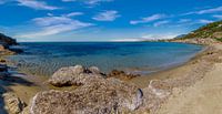 Uitzicht op de middellandse zee, vanaf het zuiden van het Griekse eiland Lesbos, een paar kilometer ten oosten van de stad Plomari. Hier komen rust, de blauwe zee en lucht en het warme zandstrand samen in een mooie panoramisch uitzicht.