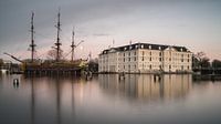 Het Scheepvaartmuseum en het replica VOC-zeilschip "Amsterdam" net na zonsondergang