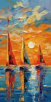 3 zeilboten met de zon op de achtergrond