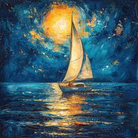 Ontdek de magische symbiose van zeilboot, zee en maan in ons indrukwekkende kunstwerk. De maritieme scène vangt de harmonieuze verbinding tussen de majestueuze oceaan en de mystieke maan, die elke kijker betovert.