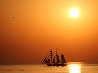 Gouden gloed  van de zon aan de lucht met een vogel en boot, zeilboot, driemaster, driepunter, schip