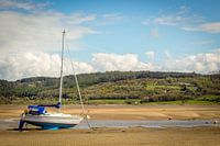Een zeilboot bij eb in een drooggevallen inham in Wales.