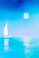 Zachte blauwe tinten omhullen een eenzaam zeiljacht dat 's nachts in de stilte van de zee glijdt. De grote, stralende maan geeft het tafereel een magisch aura en wordt zachtjes weerspiegeld in het water. Dit beeld brengt rust en een maritieme sfeer in elke woon- of slaapkamer, perfect voor dromers en liefhebbers van zeevaart.