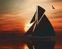 Een zeilboot vaart op de zee bij een prachtige zonsondergang Dit schilderij brengt gemakkelijk de sfeer van de zee in uw huis. Dit kusttafereel kan in verschillende formaten en op verschillende materialen worden afgedrukt. Zowel op canvas, hout, metaal of ingelijst zodat het zeker in uw interieur past.