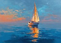 Een impressionistisch olieverfschilderij toont een zeilboot op een kalme zee bij zonsondergang. De witte en oranjekleurige zeilen steken zachtjes af tegen de helderblauwe lucht, terwijl de boot als een spiegel in het water wordt weerspiegeld. De harmonieuze compositie en fijne details creëren een vredige, rustgevende sfeer. Zachte penseelstreken en warme lichtreflecties benadrukken de rust van het moment en nodigen uit om te blijven hangen. Dit kunstwerk straalt maritieme flair, harmonie en sereniteit uit - ideaal voor liefhebbers van impressionistische olieverfschilderijen en sfeervolle landschappen.