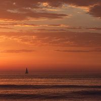 Een zeilboot keert terug naar de haven van Den Haag bij zonsondergang. De intense kleuren van de hemel worden weerkaatst op het oppervlak van een vrij kalme noordelijke zee, waarbij de schaduwen van de golven diepte scheppen in de scène. Zit, kijk, mediteer.