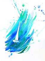 Zeilboot danst in de golven is een aquarel schilderij in portret formaat geschilderd door de kunstenaar Karen Kaspar. Een kleine witte zeilboot met een slank wit zeil wordt omringd door geabstraheerde levendige golven in verschillende tinten licht- en donkerblauw, blauwgroen en turkoois, die op en neer dansen in de golven. Aan boord van…