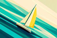 Met zachte golven in harmonieuze blauw- en groentinten en een felgeel zeil straalt dit kunstwerk een gevoel van vrijheid en avontuur uit. De heldere, geometrische vormen en het rustgevende kleurenpalet creëren een ontspannen sfeer die perfect is voor een woonkamer waar je de stress van alledag achter je wilt laten.