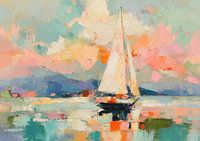 Een zeilboot glijdt over de kalme zee, omgeven door zachte pastelkleuren en zachte penseelstreken. Het impressionistische olieverfschilderij legt een vredige, dromerige sfeer vast waarin de lucht en de bergen in de verte weerspiegeld worden in het stille water. Het delicate licht creëert zachte schaduwen en subtiele reflecties, terwijl de zichtbare textuur van de verf en het doek het werk diepte geeft. Het harmonieuze kleurenpalet van blauwe, roze en beige tinten creëert een sfeer van rust, evenwicht en tijdloze elegantie.