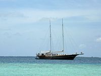 Zeilboot nabij een idyllisch eiland bij de Maldiven. Je ziet hier goed de verschillende tinten blauw die je daar overal ziet. Deze foto heb ik genomen tijdens een excursie naar een paradijselijk eiland met witte zandstranden en helder water. Prachtig om te snorkelen.