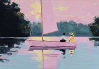 Dit impressionistische schilderij toont een roze zeilboot op kalm water bij zonsondergang. De zeilen wapperen zachtjes in de wind terwijl twee figuren aan boord zitten: een in het geel, de ander in het wit. Het water weerspiegelt de lucht en de boot, waardoor diepte ontstaat. Links en rechts omlijsten verschillende groentinten van de…