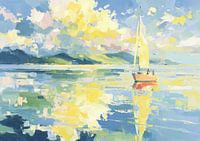 Een impressionistisch olieverfschilderij toont een zeilboot die kalm over zomers water glijdt. Zachte gele en blauwe tinten creëren een vredige, harmonieuze sfeer, terwijl lichte reflecties op het wateroppervlak diepte en levendigheid geven. Eén persoon zit in de boot, omringd door tere bloemblaadjes die zachtjes op het water drijven. De zachte penseelstreken en het harmonieuze kleurenpalet stralen rust, sereniteit en poëtische schoonheid uit. Het werk vangt de stille magie van een vredig zomermoment, waar natuur, licht en beweging elegant samensmelten om een tijdloze, dromerige sfeer te creëren.