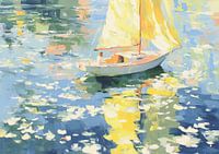 Een olieverfschilderij in impressionistische stijl toont een zeilboot op een kalme zee, omringd door zachte gele en blauwe tinten in de lucht. Dikke penseelstreken en zachte lichtaccenten geven de scène diepte en levendigheid. Het wateroppervlak weerspiegelt de lucht, de boot en de bergen in de verte, terwijl op de achtergrond mensen op een jacht zeilen. Het harmonieuze pastelpalet, de delicate weerspiegelingen en de stemmige compositie creëren een vredige, poëtische sfeer. Dit kunstwerk vangt de stille schoonheid van het moment en combineert landschap, licht en maritiem motief in een elegante, impressionistische afbeelding.