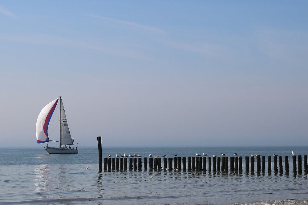 Een zeilboot vaart langs waterbrekers en worden gadegeslagen door een groep meeuwen