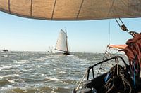 Een doorkijkje onder het zeil door naar een andere zeilboot. Zeilen en varen op de Waddenzee verveeld nooit.