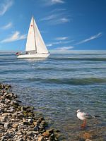 Een zeilboot varen op de kust, op de voorgrond een meeuw.