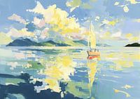 Een zeilboot glijdt zachtjes over de kalme zee, het oppervlak weerspiegelt de lucht en de wolken. Het schilderij, geschilderd in delicate pastelkleuren, vangt de vredige sfeer van een rustig moment. De mensen aan boord bewegen rustig, vastgelegd in impressionistische penseelstreken. Op de achtergrond verschijnen eilanden in de verte, die diepte en uitgestrektheid verlenen. Het samenspel van licht, kleur en reflectie creëert een sfeer vol harmonie en sereniteit - een poëtisch werk dat de rust van de zee en de schoonheid van het moment vastlegt.