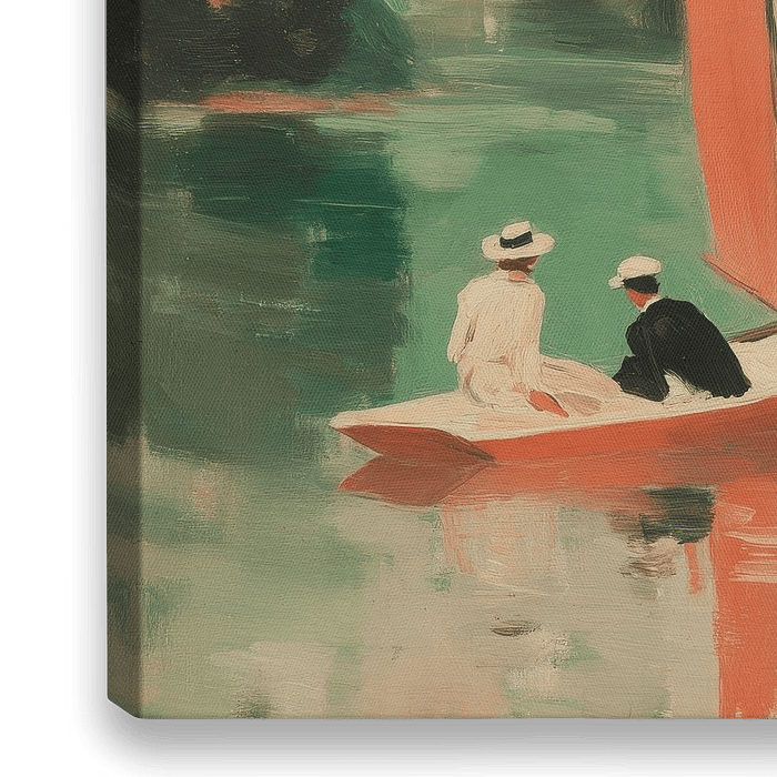Een impressionistisch schilderij toont een zeilboot op kalm water, gepositioneerd in het midden en naar rechts georiënteerd. De boot heeft een fel oranjerode romp en een gedeeltelijk uitgerold wit zeil. Aan boord zitten twee mensen naast elkaar, de een in een lichtgekleurd overhemd en wijde hoed, de ander in een donker topje met witte…